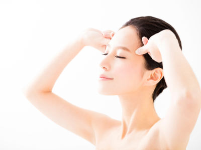 1. まず額の中央から両サイドの髪の生え際に向かって、指の腹で優しく押し流します。