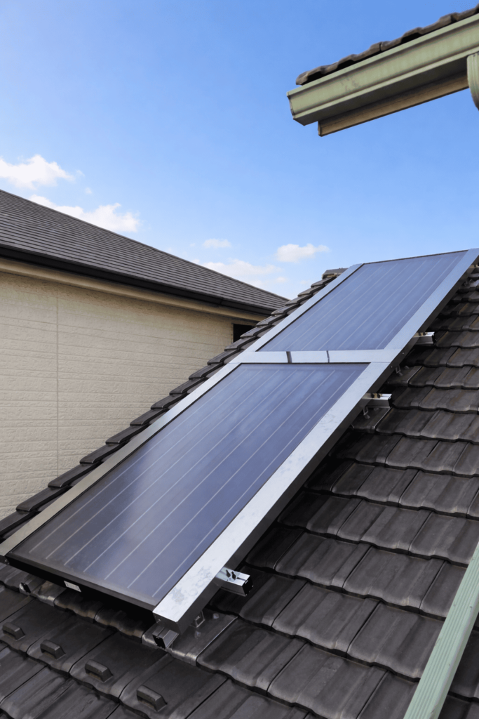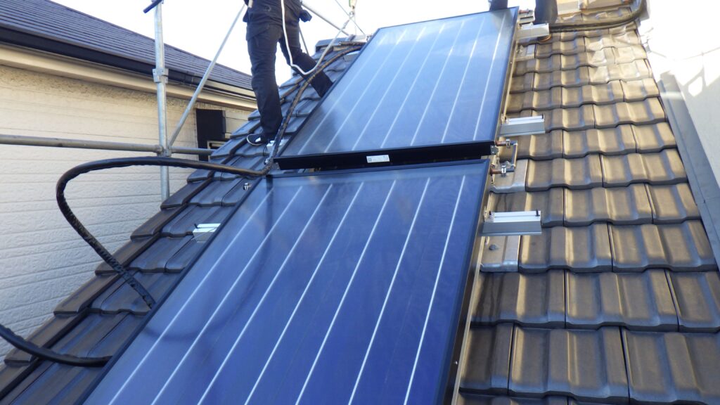 ご自宅にすでに太陽光発電システムを導入されていらっしゃるお客様の太陽熱給湯システム「ReTerra」の設置事例となります。集熱器については、設置スペースの関係で、縦列での設置となっております。多くの太陽熱温水器は横に並べての設置がほとんどですが、ReTerraの場合では、設置架台や接続方法を工夫して、オプションにて縦列での設置もご検討いただけます。